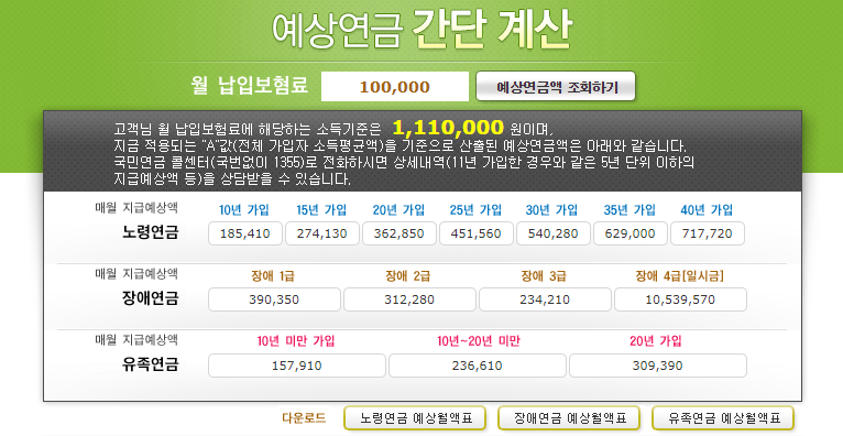 100,000원을 납입한다고 가정한뒤 예상연금액을 조회하였더니 10년 가입을 유지하면 185,410원이고 20년을 계속가입하면 362,850원입니다. 2020년을 기준으로 잡아본것이니 해가 바뀔수록 더 오를수도 있을 것이라고 봅니다.