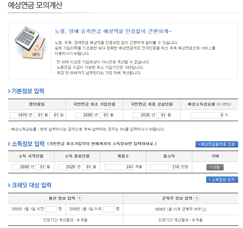 예컨데 월소득 210만원, 가입기간은 241개월로 임의적으로 만들어보고 국민연금 수령액은 얼마나 되는지 알아보기를 해보았습니다. 거의 20년가까이 일을 한 매우 성실한 사람으로 만들었지만 사실 요즘 같은 시대에 20년이나 내는것도 그리 쉬운것은 아닙니다.